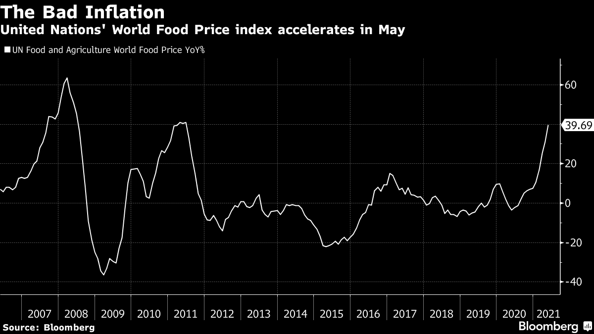 在发达世界考虑这种复苏带来的通货膨胀是否会逗留太久的同时,新兴市场的压力开始显现。全球食品价格连续上涨了12个月,使联合国的一个衡量指标达到十多年来的最高点。
