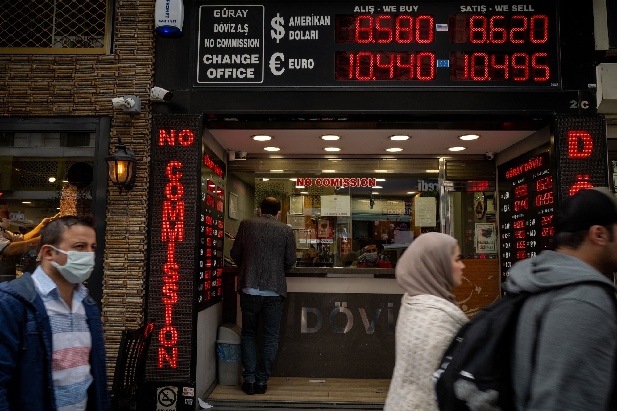 一位顾客在2021年6月2日星期三使用伊斯坦布尔的一家货币兑换局。尽管通胀率居高不下,土耳其总统雷杰普·塔伊普·埃尔多安仍再次呼吁降低利率,导致里拉兑美元创下新低,并促使中央银行行长抵制即将出现的降息预期。摄影师:Nicole Tung/Bloomberg