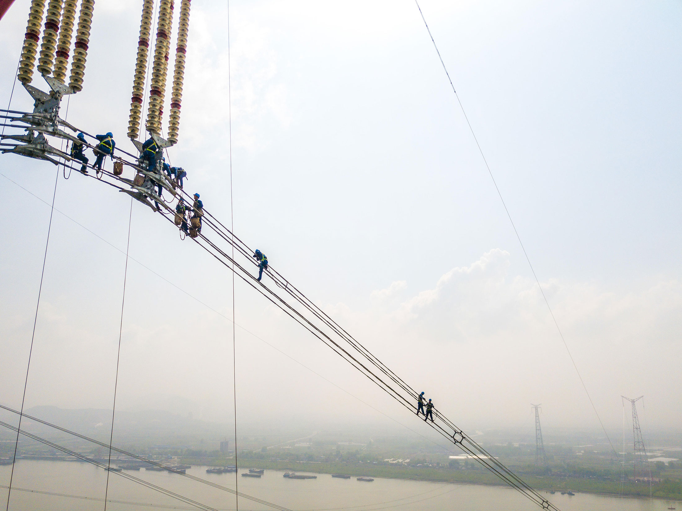 长江沿线的长吉-古泉特高压直流输电线上的中国工人。