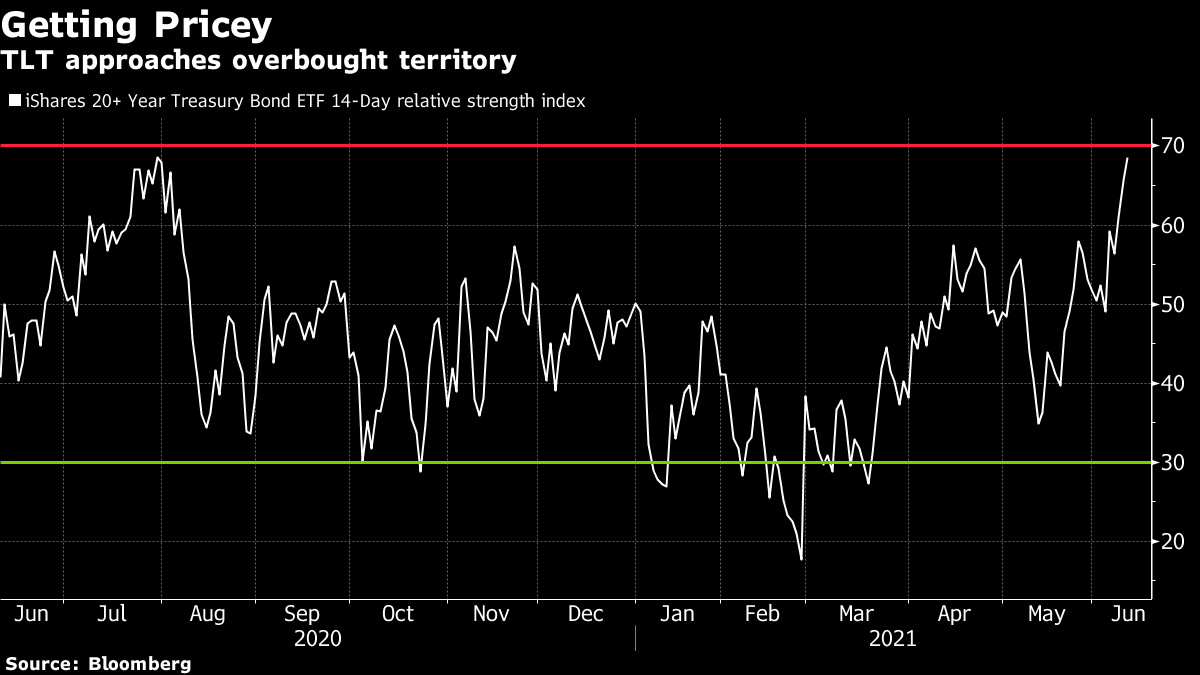 在面对显然是一个炙手可热的经济时,这场涨势能持续多久还有待观察。如果你是一个关注图表的人,有理由认为它可能很快会放缓。iShares 20+年期国债ETF的14天相对强度指数自去年7月以来最接近超买区域—接下来的一个月看到了5%的下跌。