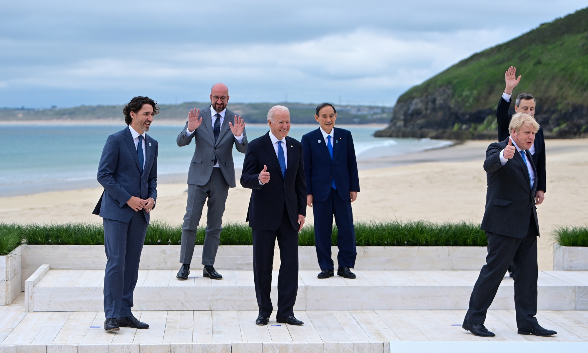 从左起,加拿大总理贾斯汀·特鲁多,欧洲理事会主席查尔斯·米歇尔,美国总统乔·拜登,日本首相菅义伟,英国首相鲍里斯·约翰逊和意大利总理马里奥·德拉吉于6月11日在英国卡比斯湾举行的七国集团峰会首日合影。