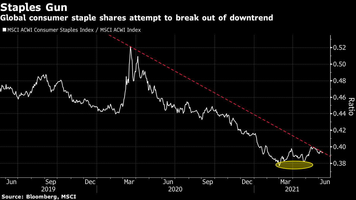 投资者经常忽视的全球消费品股票似乎正试图突破长期表现不佳的时期。MSCI该行业的指数正在回测其疫情后的下降趋势,一旦突破,将为进一步上涨打开大门。该行业在三月份达到了13年的相对低点,并且自那时以来一直在巩固。作为一个防御性行业,消费品股票与其消费性可自由支配的同行相比表现不佳,分析师们预计当经济完全重新开放时,后者将从任何多余储蓄的激增中受益。