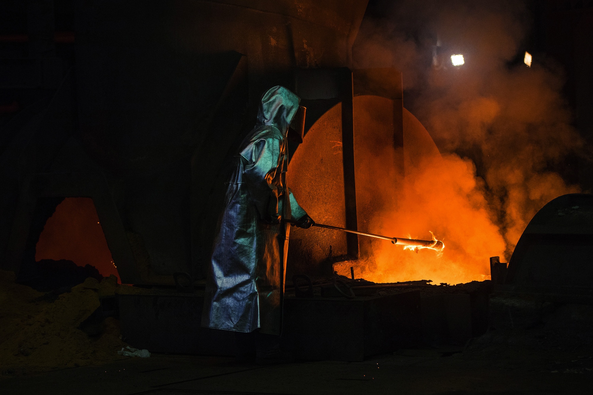 一名员工在德国杜伊斯堡的蒂森克虏伯金属厂进行铁生产时测量高炉温度。摄影师:Krisztian Bocsi/Bloomberg