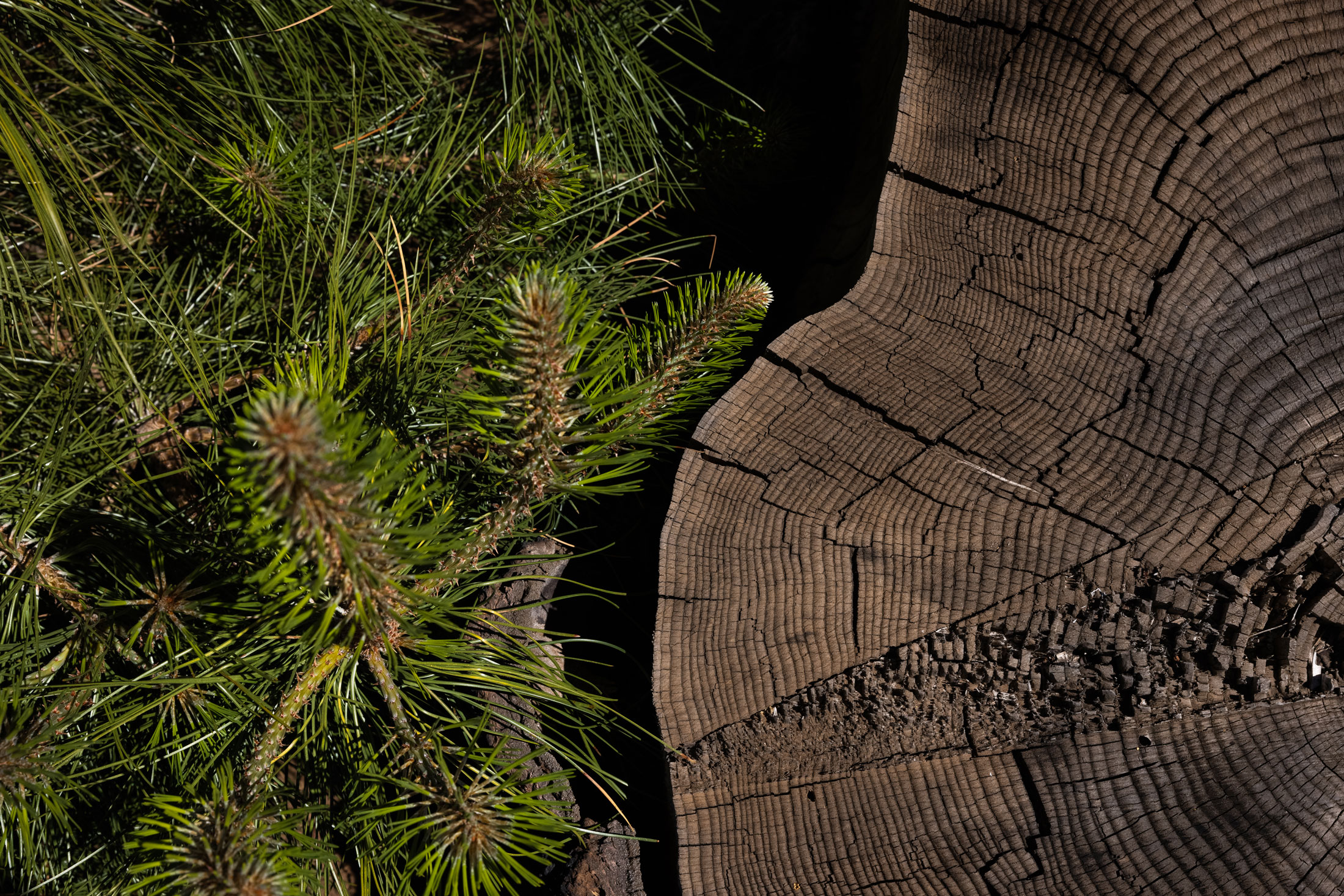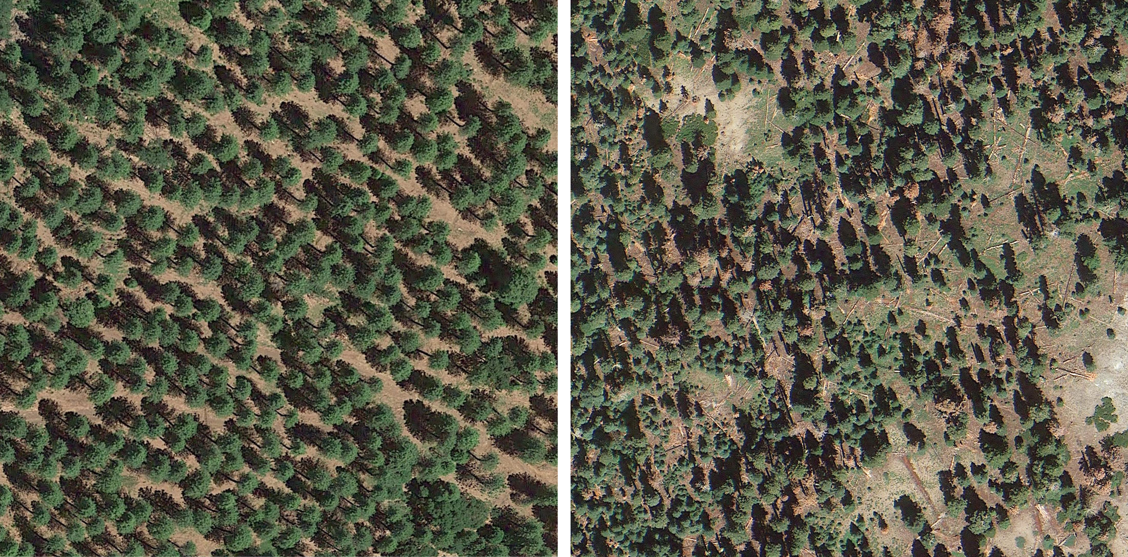 对比埃尔多拉多国家森林和约塞米蒂国家公园的卫星图像,前者曾经每年生产195万英尺的木材,后者被管理为荒野并自上世纪70年代以来一直进行受控燃烧处理,显示出了差异:前者更加密集,许多树木呈对称排列,某些区域让人联想到美国中西部农场上的玉米田。后者更像是一个拼贴图,夹杂着草地和大片裸露区域。