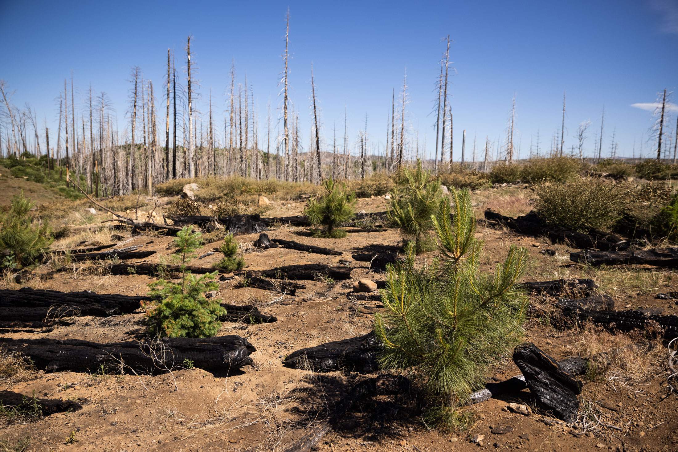这些小树是在今年早些时候在沃尔什的监督下种植在这里的,作为对庞大的金火灾烧伤区约8000英亩土地的持续重新种植的一部分。她设计这个区域来模仿几十年频繁、低强度火灾所造成的在更成熟森林中会出现的清除植被的间隙。新兴的科学研究表明,在加利福尼亚州森林中创造更多这种斑驳、集群的镶嵌图案可能会使它们更具抗火能力。