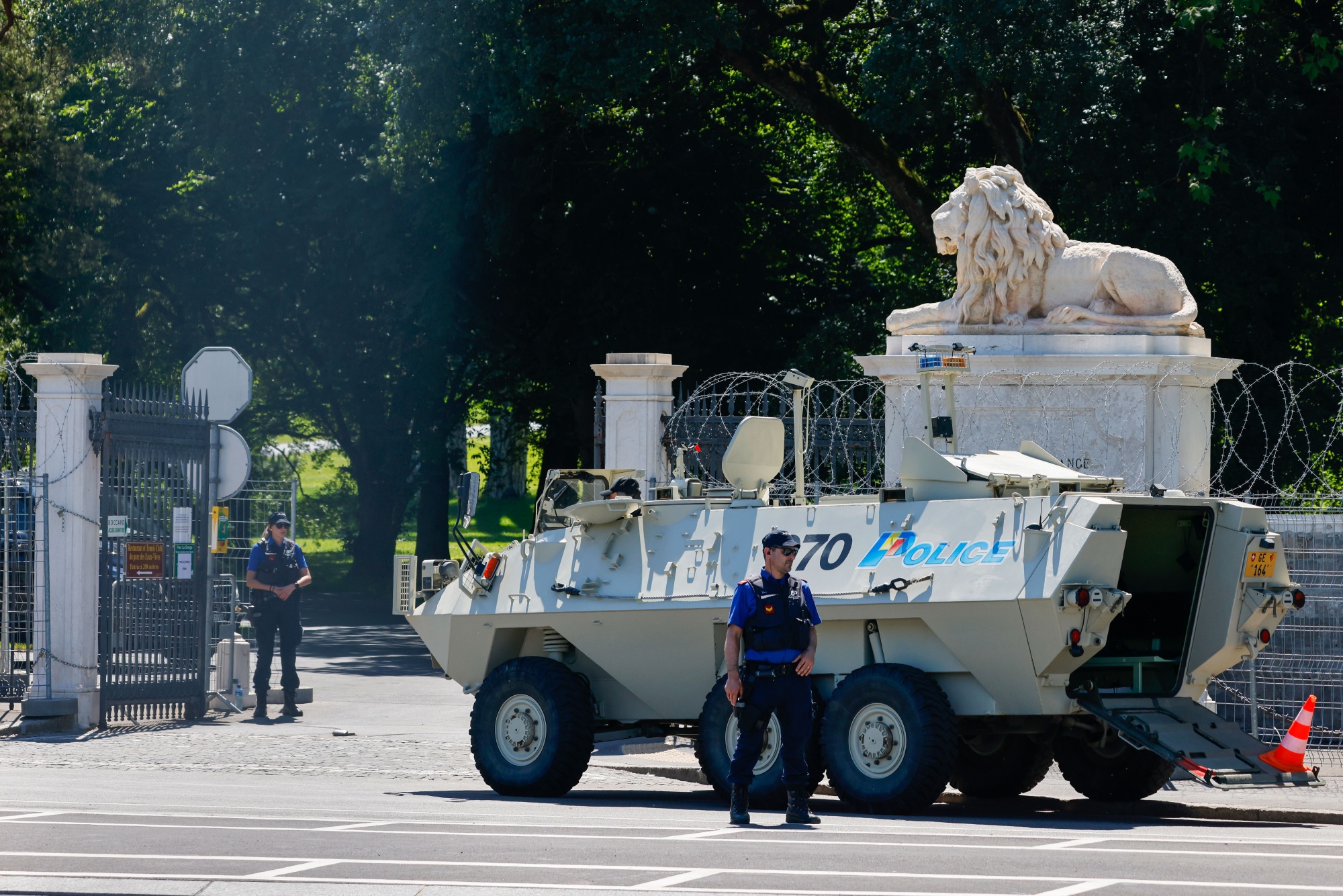 今天在日内瓦的拉格朗日别墅外的一辆装甲警车。摄影师:Stefan Wermuth/Bloomberg