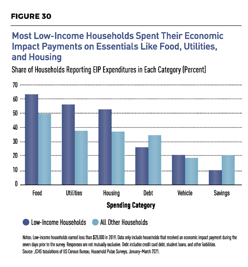 许多租户将因疫情而留下长期的财务伤痕。联合中心对调查数据的审查发现,大约四分之一因新冠疫情失去工作的租户报告称“储蓄大幅减少”,四分之一的人向亲朋好友借钱,10%求助于高利息的“发薪日”贷款或个人贷款。除了食品和公用事业,住房成本吸收了低收入家庭刺激支票的相当份额。
