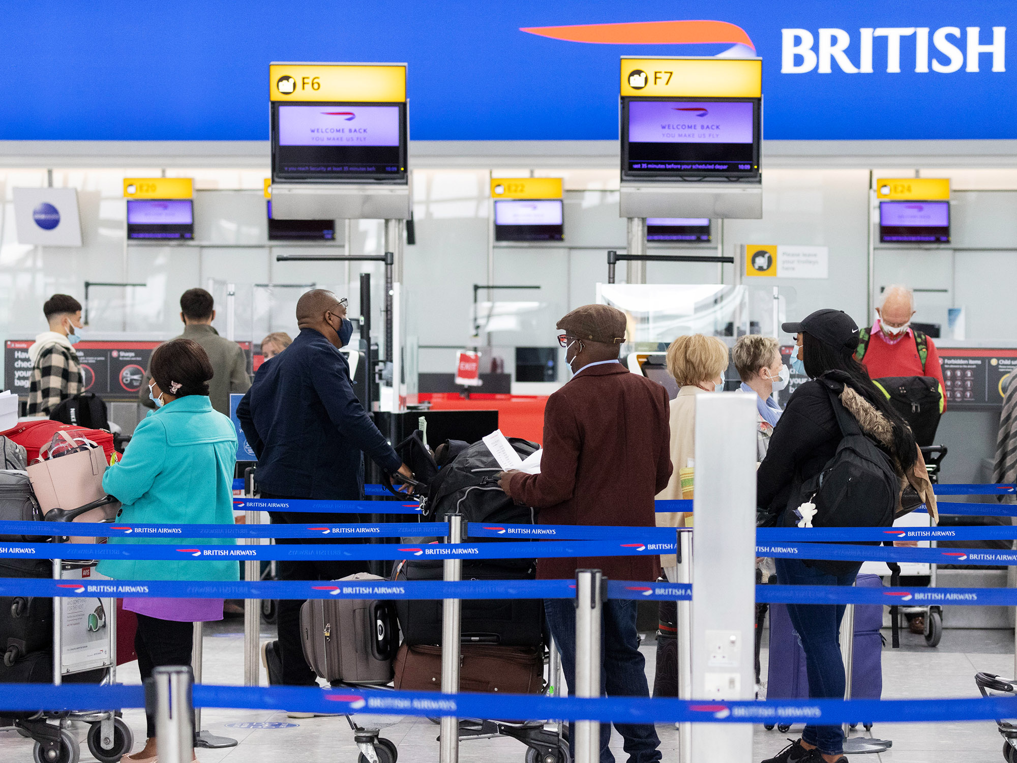 乘客在伦敦希思罗机场的办理登机手续处等候。