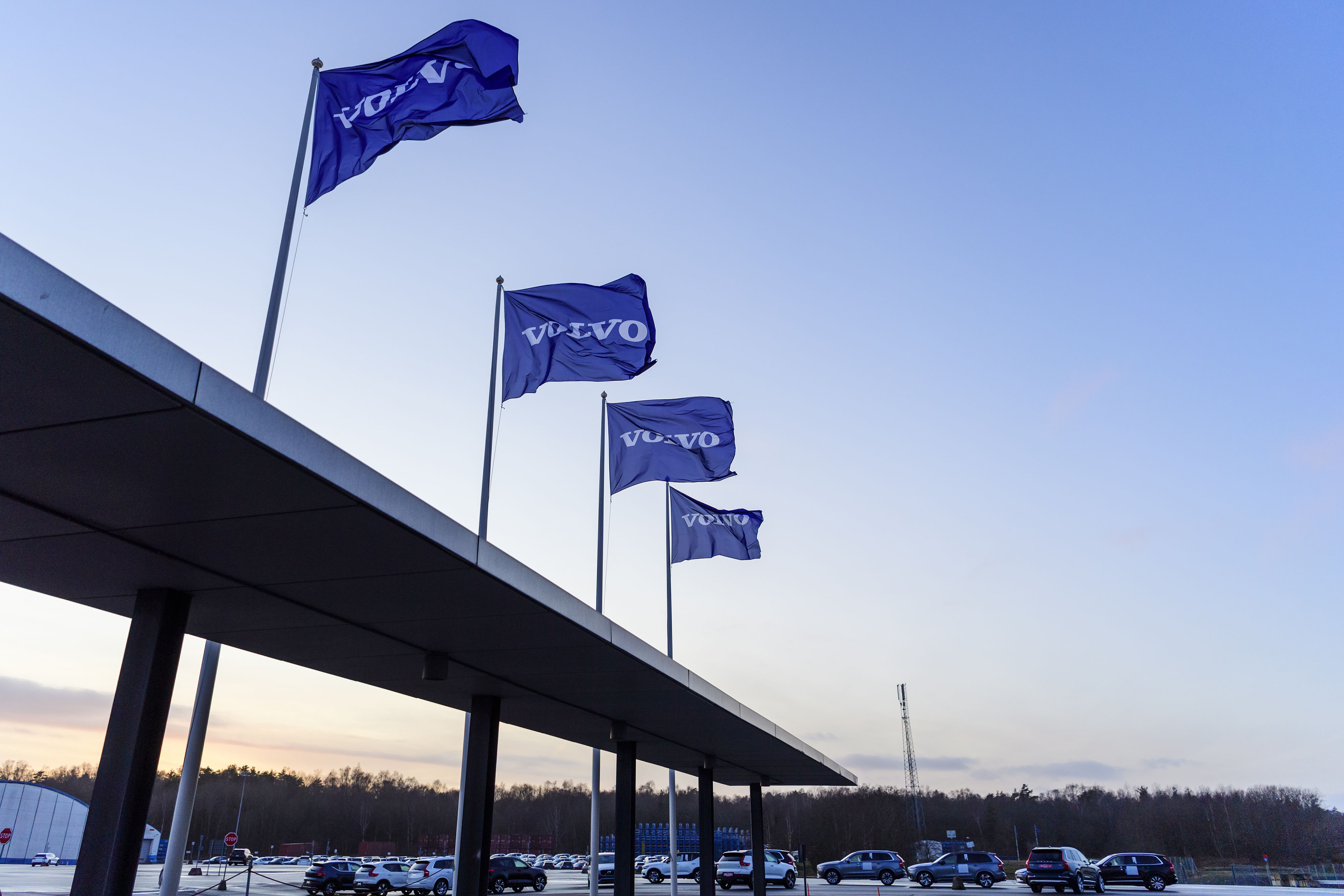 旗帜飘扬在瑞典哥德堡的沃尔沃停车场。