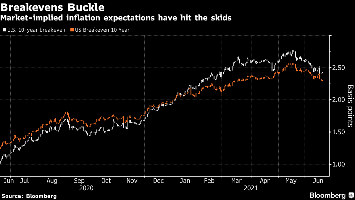 那另一个通胀预期赌注呢?那些押注通胀保护证券(TIPS)的投资者认为情况可能失控,他们这周也过得不太好。通胀预期差(通过常规国债和TIPS之间收益率差异推导出的市场通胀预期的代理)在美联储声明后暴跌。