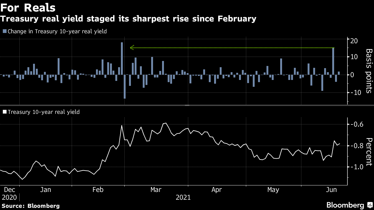 总的来说:实际收益率上升。美联储对通胀的宽容立场——即政策将在复苏过程中保持宽松——一直是深度负实际利率的重要支撑。