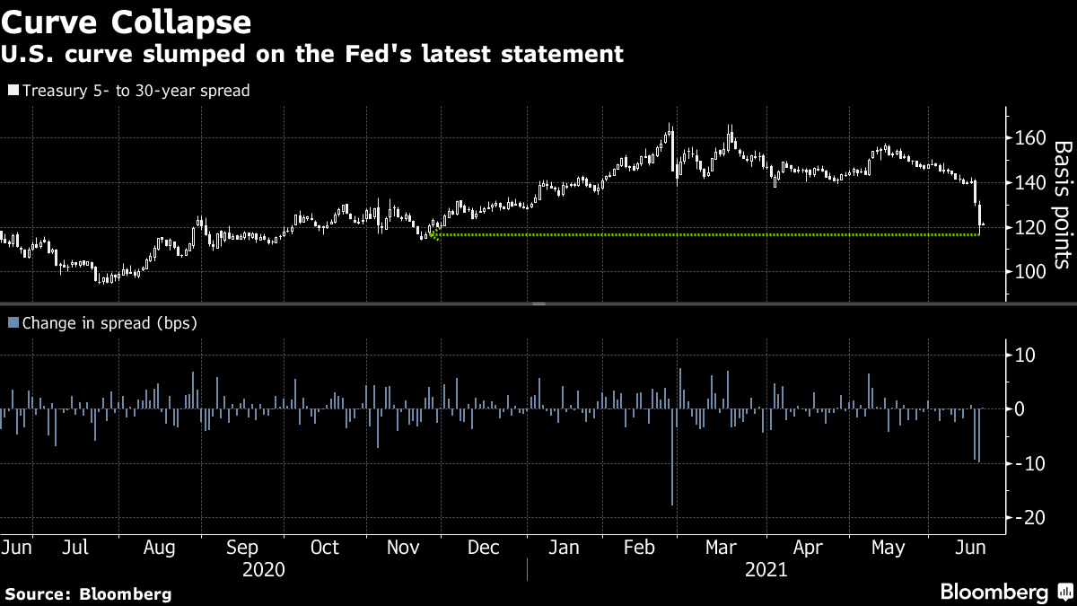 首先让我们考虑一下曲线。截至周二,陡峭化交易是您的通胀预期赌注。也就是说,预计长期债券的收益率会上升(与更强劲的增长和价格压力相一致),相对于短期债券的收益率。在联邦储备委员会承诺再过几年维持接近零利率的情况下,短期债券的收益率被锚定。曲线的五到30年区间是这种交易的典型代表。现在看看它。