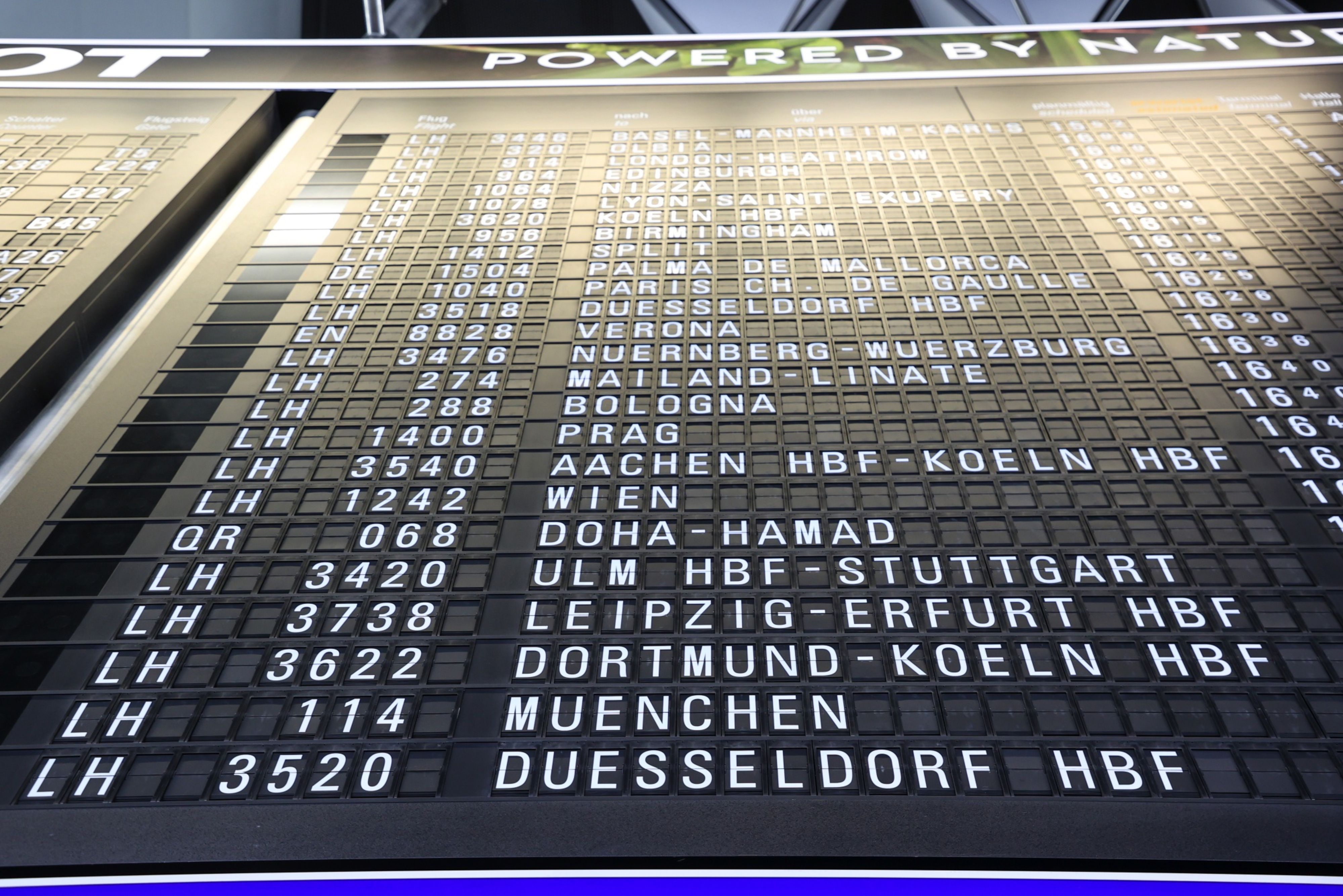法兰克福机场四月份的出发信息牌上显示的火车和航班。德国汉莎航空公司和德国国家铁路公司正在合作提供快速列车服务,这可能取代短途航班,人们越来越关注航空业的碳排放问题。