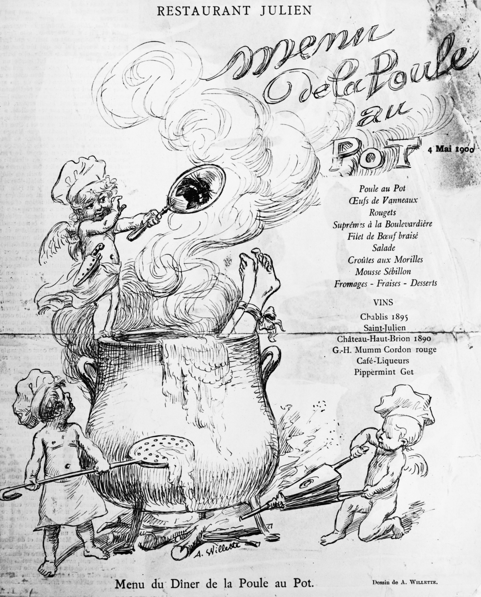 巴黎餐厅Julien的一份1900年菜单。图片由Hulton Archive/Getty Images提供从19世纪到1840年代初,早期菜单——一个法语术语,指的是一份小而详细的清单——看起来很像报纸,葡萄酒清单印在底部,通常是连载小说的位置,她说;后来,它们看起来更像平装书;19世纪末的新印刷技术引入了由亨利·德·图卢兹-洛特列克等艺术家绘制的复杂的新艺术菜单。在20世纪,菜单设计反映了不断变化的文化品味和用餐作为日益受欢迎的选择,成为不断增长的城市中产阶级的选择;战后时代带来了防水塑料覆膜、有趣的新奇形状,以及儿童菜单;20世纪60年代以迷幻图形为特色。到20世纪末,菜单已经成为用餐的必备品、计算工具和“选择”的代名词。
