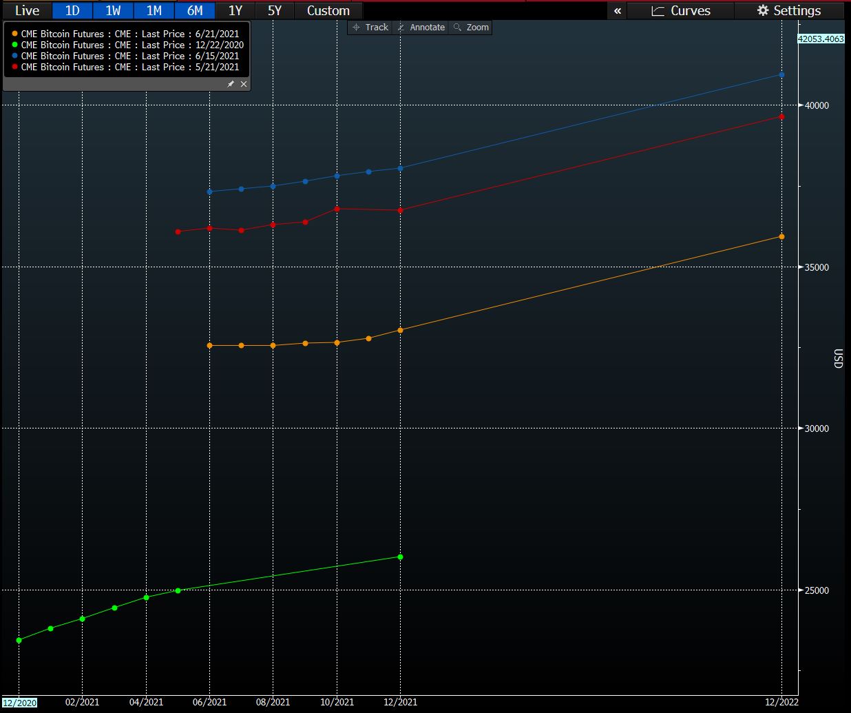 中国对加密货币的重新打击导致了矿业关闭,这反过来影响了新比特币的供应,并使哈希率降至六个月低点。与此同时,本月早些时候比特币期货首次自2018年以来进入逆转状态 — 意味着交易员正在以高于长期合同的水平定价近期合同。现在曲线继续不断下降,如下图所示。