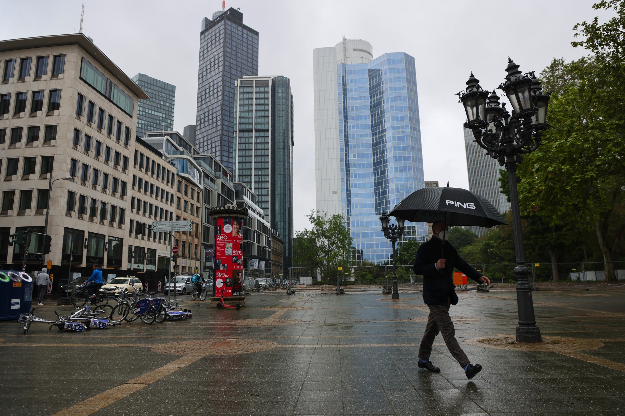 法兰克福金融区的一名工人。摄影师:Alex Kraus/Bloomberg