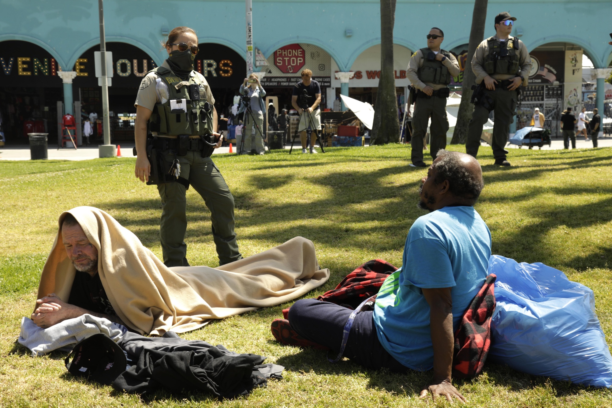 洛杉矶县警长副手正在与在威尼斯街头睡觉的人交谈。 洛杉矶县的J措施将从县预算中的一些资金转向社会服务替代警务,包括应对无家可归问题的政策。
