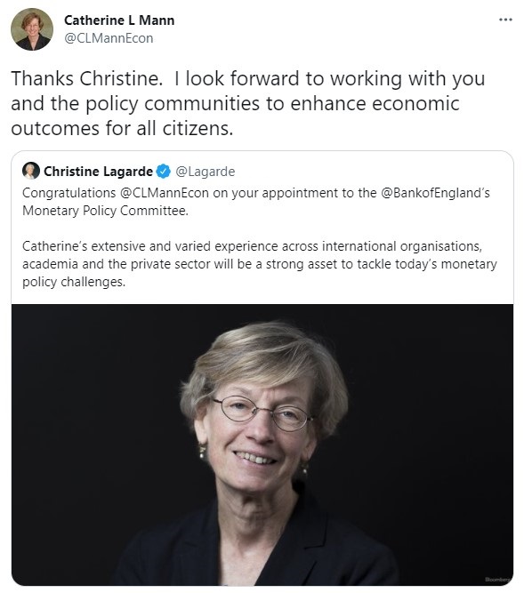 花旗集团前首席经济学家凯瑟琳·曼(Catherine Mann)宣布将加入英格兰银行政策制定委员会后受到了热烈欢迎。