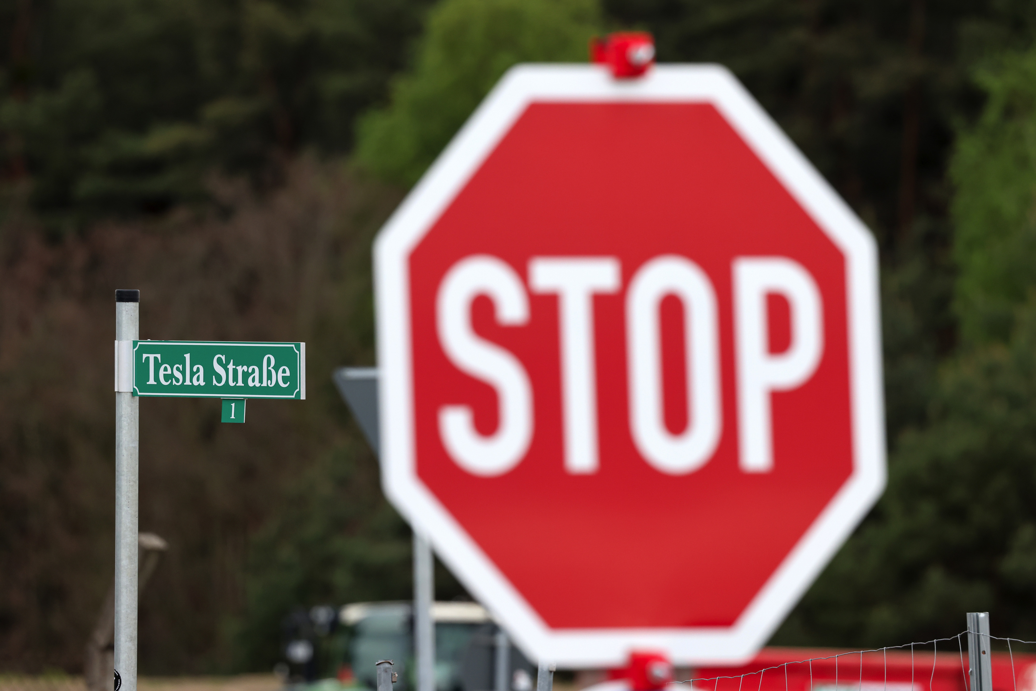 特斯拉在德国Gruenheide工厂建设工地的交通停车和街道标志。