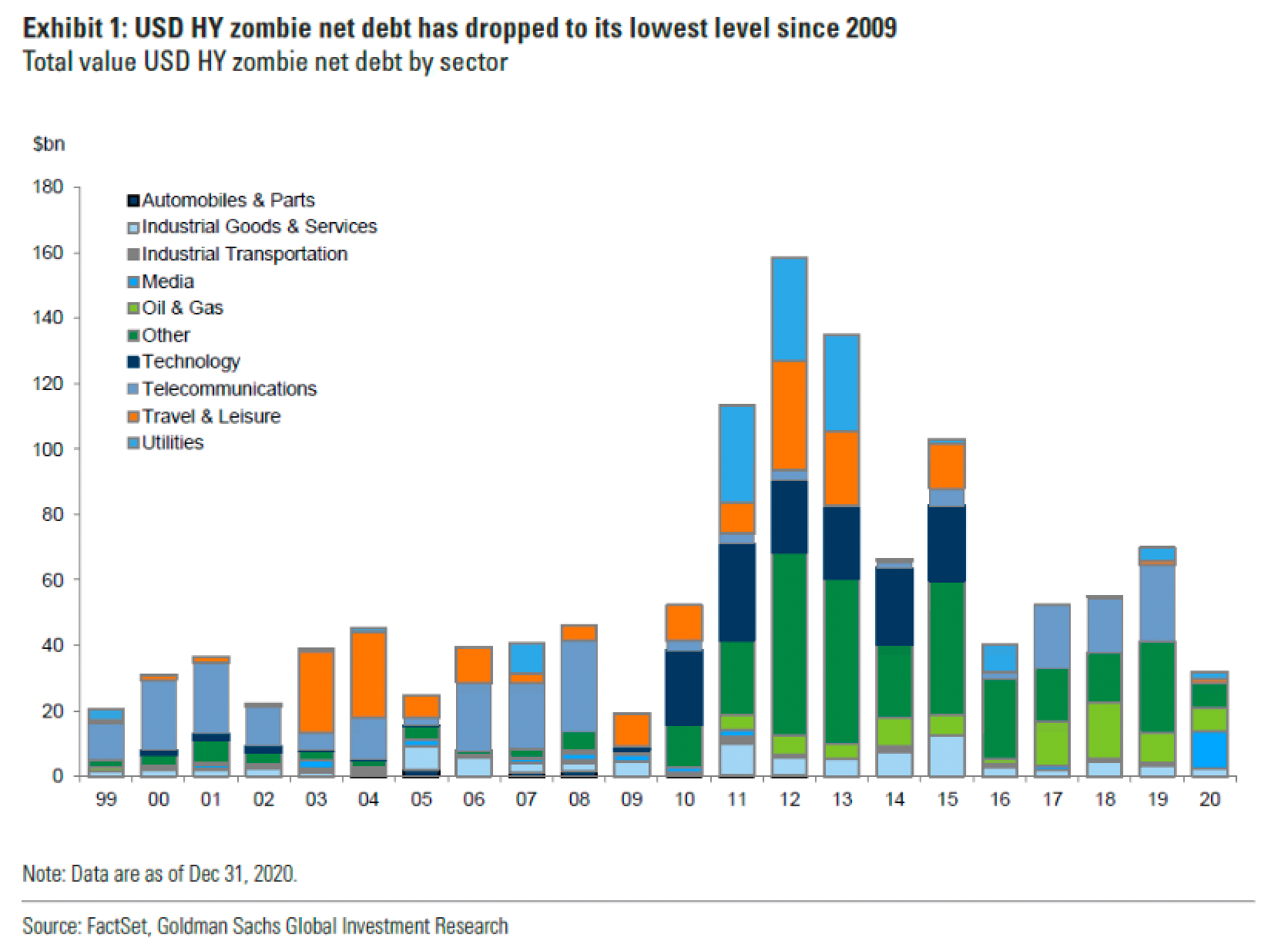 随着明星的崛起,僵尸公司就会消亡。根据高盛集团的数据,所谓的僵尸公司——那些收入无法支付利息的公司——发行的高收益债务总额实际上从2019年底的700亿美元下降到2020年底的300亿美元,达到2009年以来的最低水平。