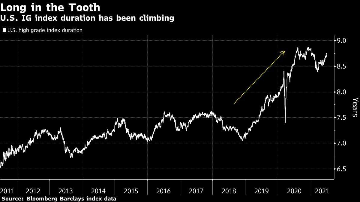 如果美联储在2023年实施加息,这些动态将如何演变将会很有趣。彭博巴克莱美国高级指数的平均久期目前为8.7年,高于2018年底的7年。对于垃圾债券等价物,久期约为3.9年,而2020年初略低于3年。