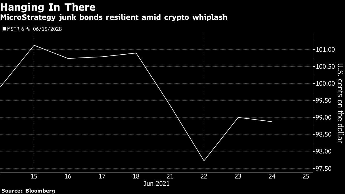 有趣的是,该公司发行的垃圾债券——唯一目的是用于比特币购买——在加密货币混乱中表现特别强劲。2028年6.125%票面利率的债券在比特币周二暴跌时跌至不到98美分的新低,此后又回升至99美分。