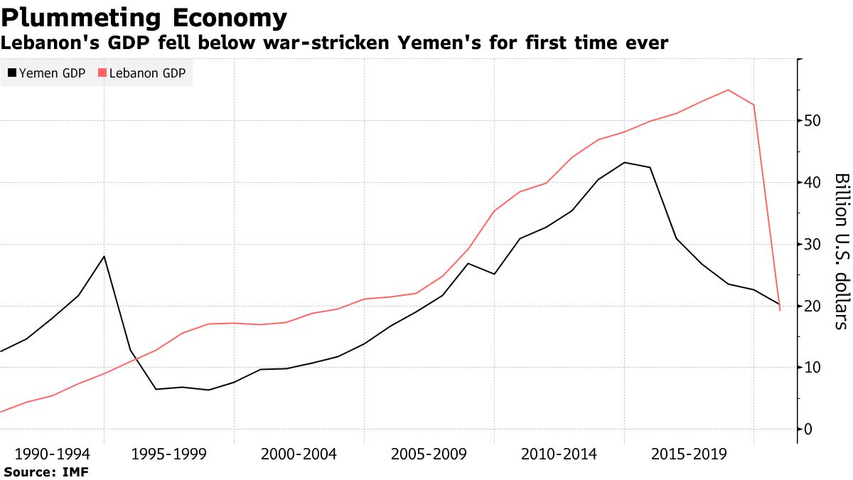 黎巴嫩的国内生产总值 暴跌 到去年仅略高于190亿美元,根据国际货币基金组织的估计。这一统计数据目前处于2002年以来的最低水平,比饱受战乱的也门还糟糕。