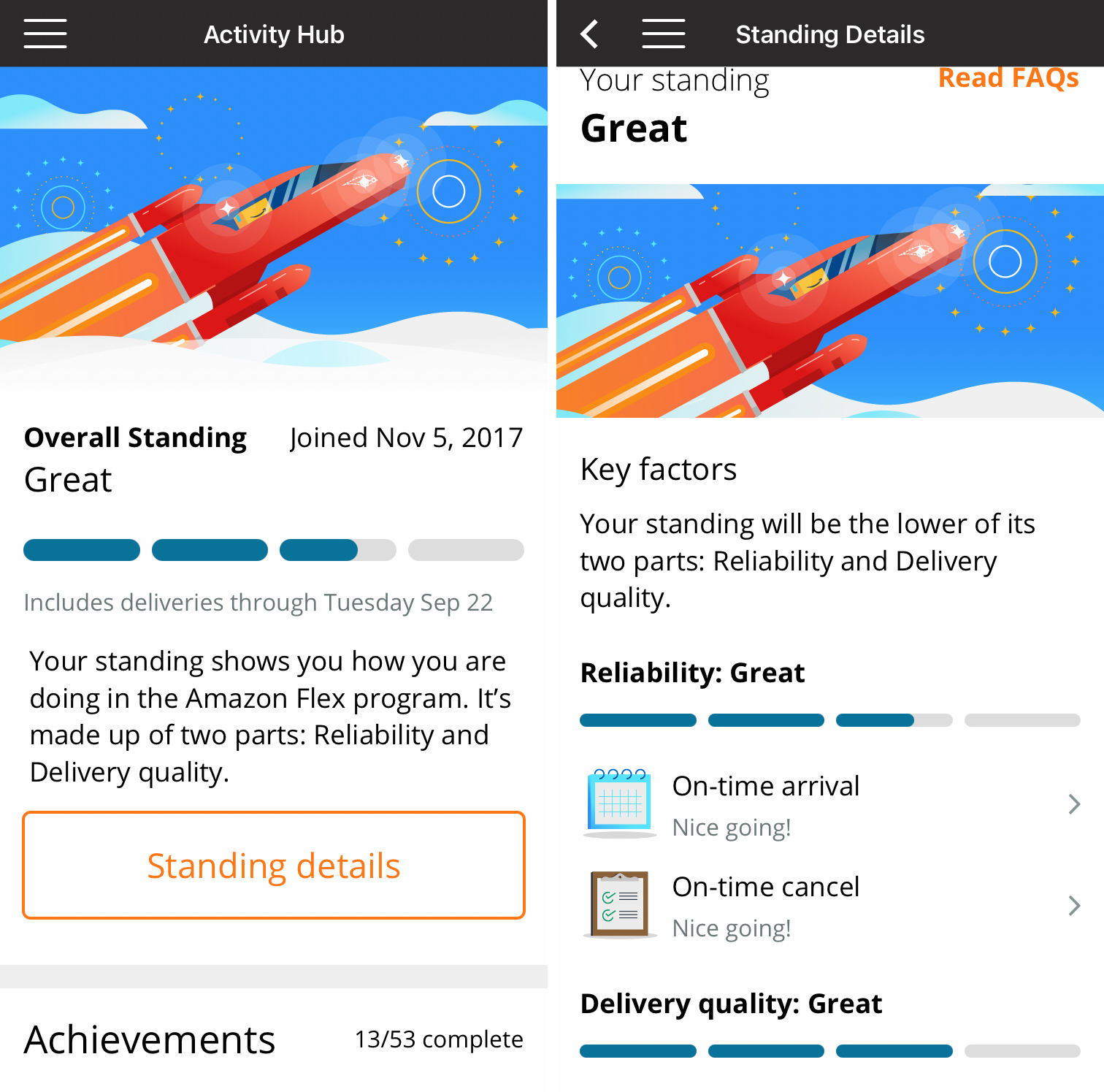 Lira 估计她大约送了 8,000 个包裹,并且大部分时间都有“很好”的表现评分。亚马逊的算法根据司机的可靠性和交付质量对他们进行评分,主要衡量标准包括他们是否按时到达取件地点、是否在预期时间窗内交付包裹以及是否遵循客户的特殊要求。Flex 的指标主要侧重于准时性,不像优步和Lyft等网约车服务,它们还优先考虑车辆的清洁度或司机的礼貌。此外,优步和Lyft 的乘客知道自己被堵在交通中时,司机不太可能因为无法控制的情况而受到处罚。