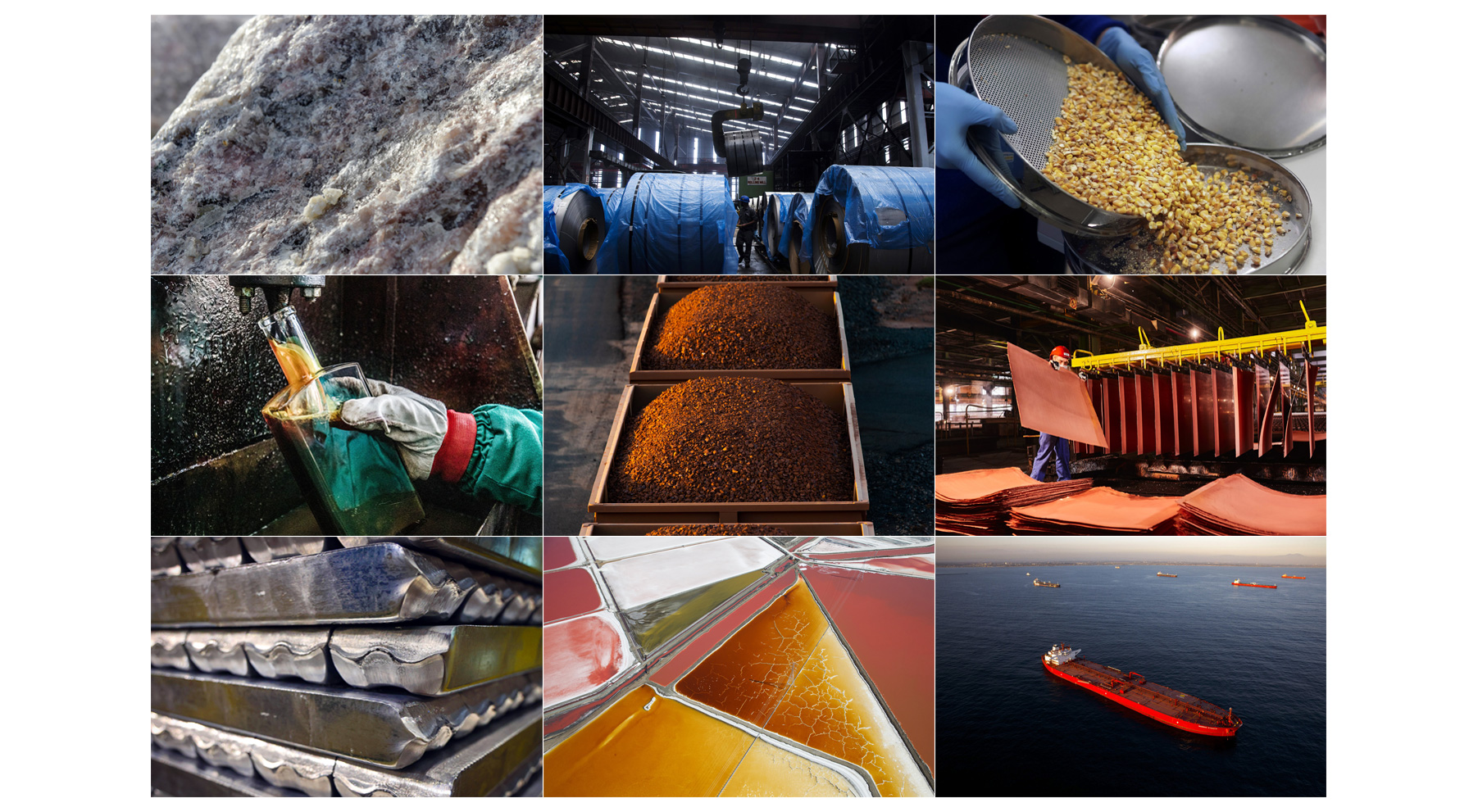 从左上角顺时针方向:锂、钢铁、玉米、铜、石油、盐、铝、柴油和铁。