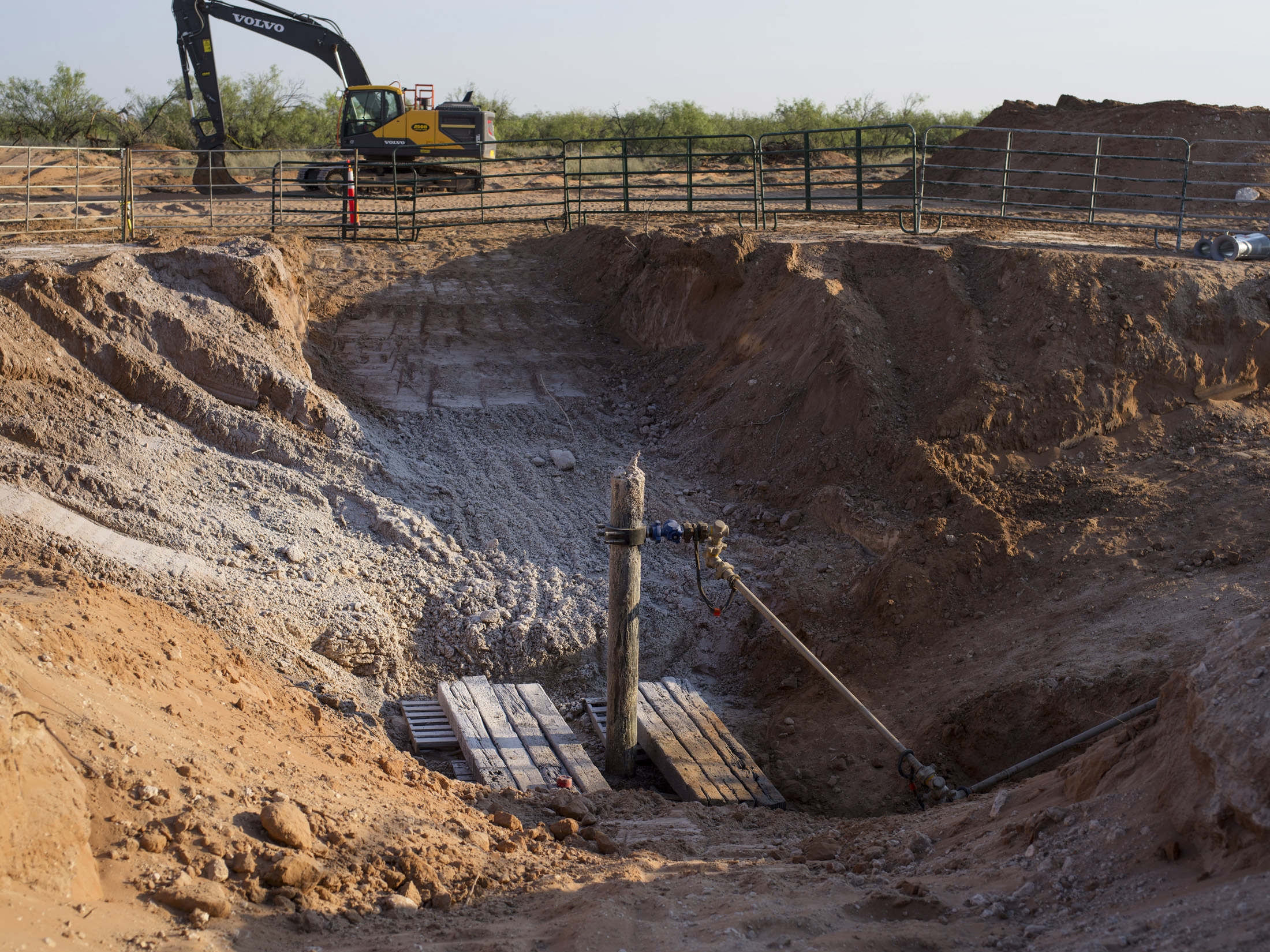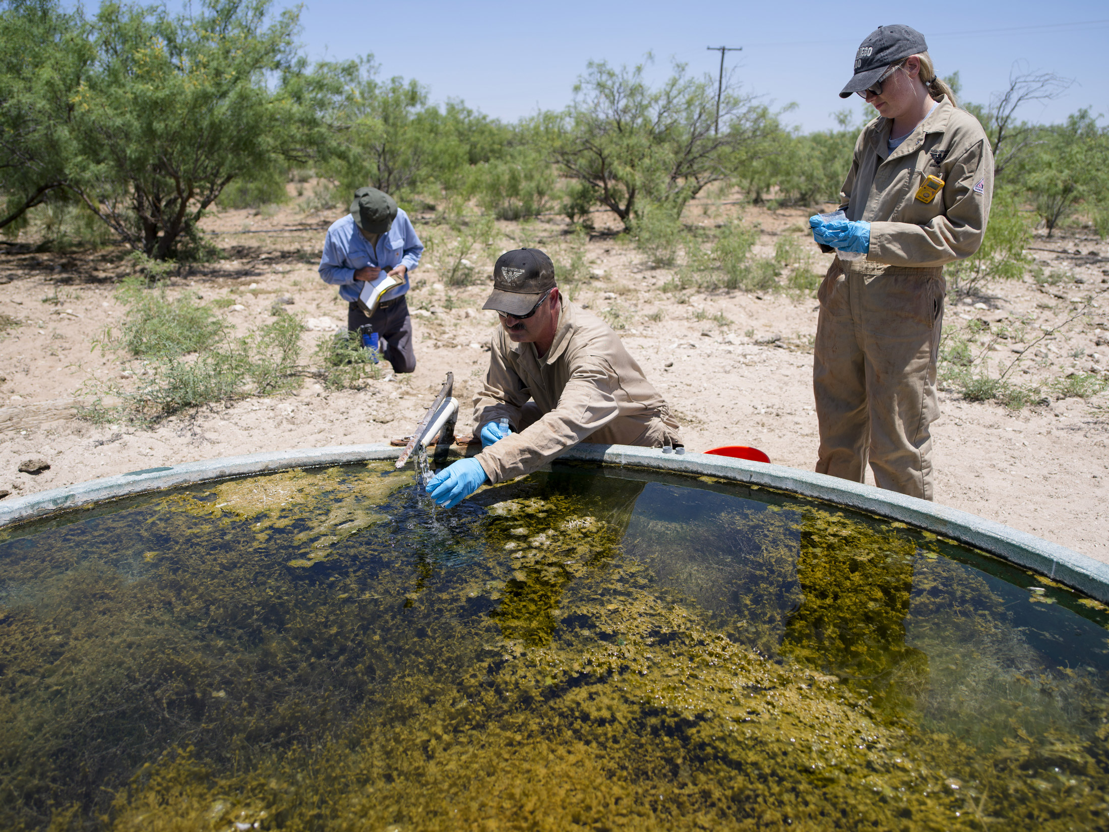 水质检测人员正在寻找污染物,他们从德克萨斯州克兰县Ashley Watt牧场地下的浅层含水层中抽取样品。