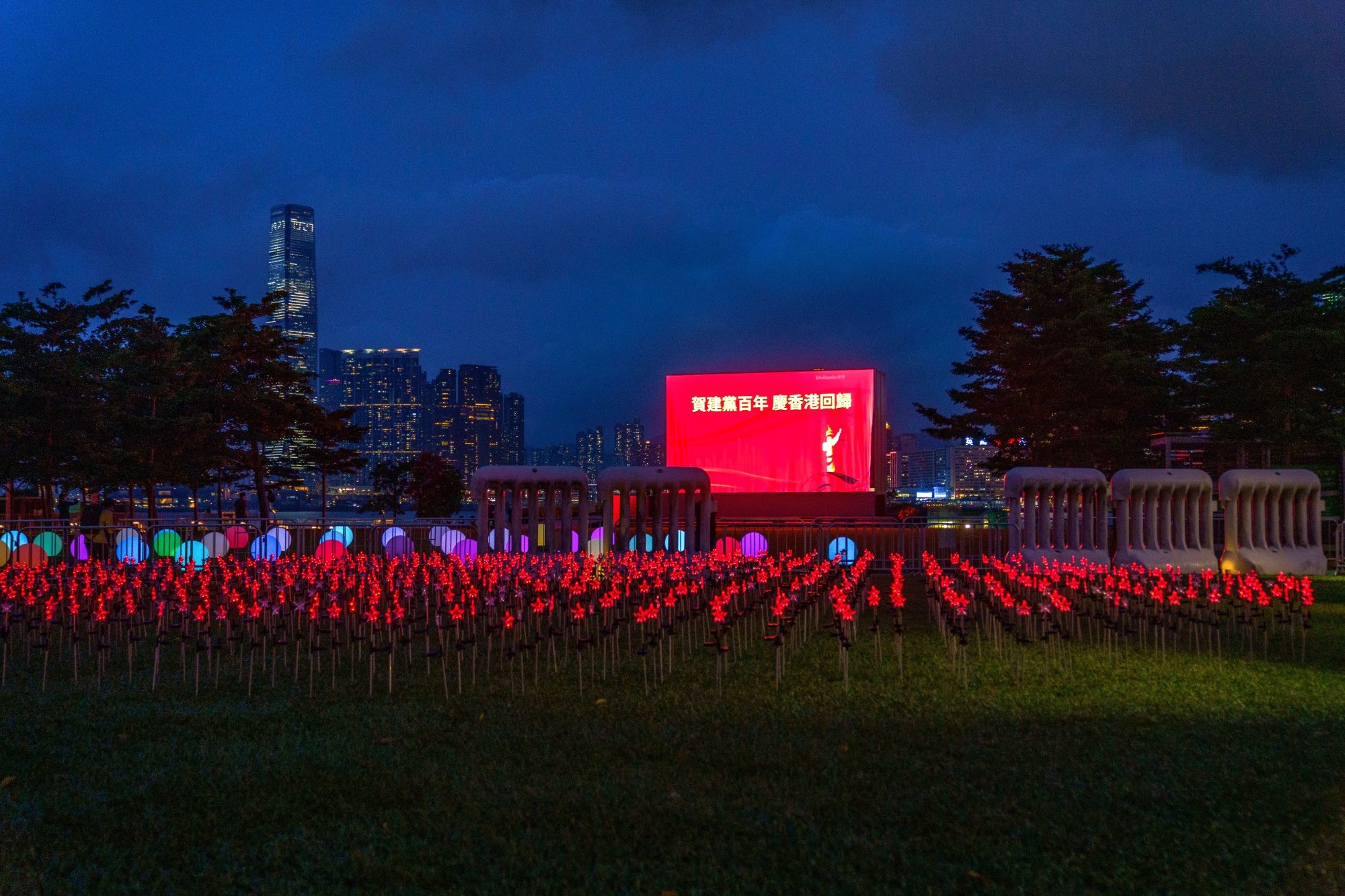 一个屏幕显示了昨天在添马公园庆祝共产党百年和香港回归中国的消息。摄影师:Lam Yik/Bloomberg