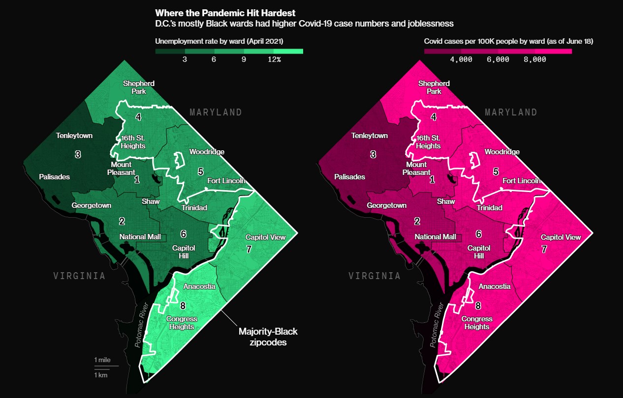 华盛顿特区正在经历一次强劲的经济复苏,这对于一个黑人和白人居民人口大致相等的城市来说是个好消息。根据彭博社的分析,哥伦比亚特区是两个种族群体中主要大都会地区中失业率最低的地区之一,这只能部分解释为何失业率低,其中一部分原因是联邦政府的就业机会集中。
