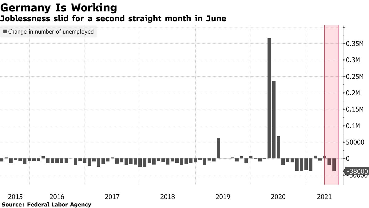 德国失业率在6月连续第二个月下降,表明随着新冠病例数量下降,商店、餐馆和文化场所得以重新开放,经济正在迅速复苏。这一下降幅度为38,000人,几乎是预期的两倍,使失业总人数达到2.69百万人。