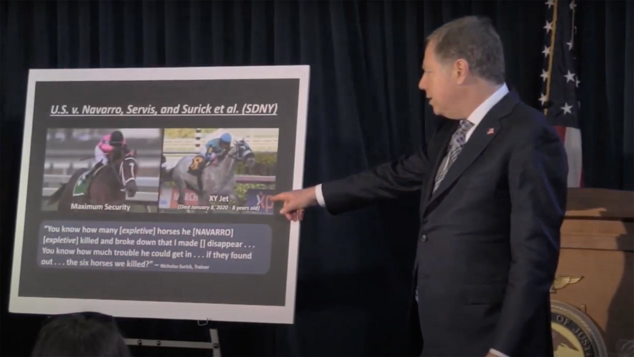 当局于2020年3月宣布对27人提起指控;后来又有两人被列入。来源:YouTubeNavarro和Servis是最引人注目的被告。南区地方法院拒绝就此事发表评论,他们被指控“共谋制造、分发和施用掺假或标签错误的药物”。Servis还被指控邮件和电信诈骗共谋。他们声称无罪,并且在保释金的等待中等待审判日期。两人的律师拒绝了多次的评论请求,并且没有就他们的客户发表任何公开声明。Navarro的继父Canet无法联系。Servis的兄弟约翰是一名赛马训练师,他在2004年与Smarty Jones赢得了肯塔基德比赛,他拒绝置评。
