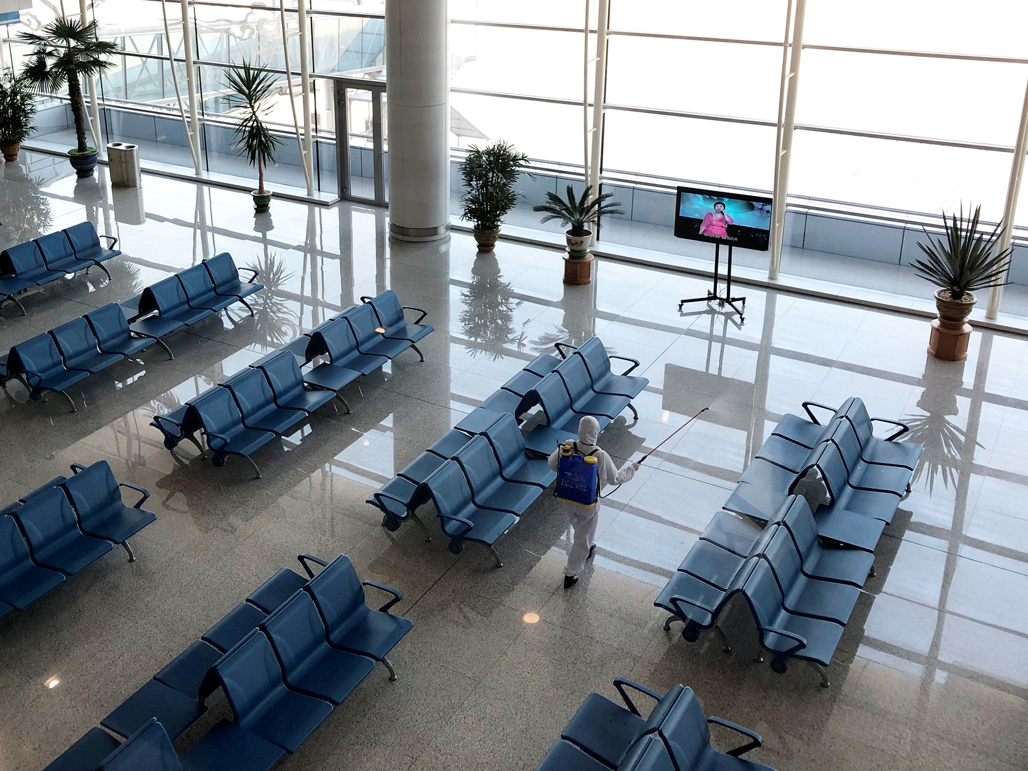 一名员工正在平壤国际机场消毒公共场所。