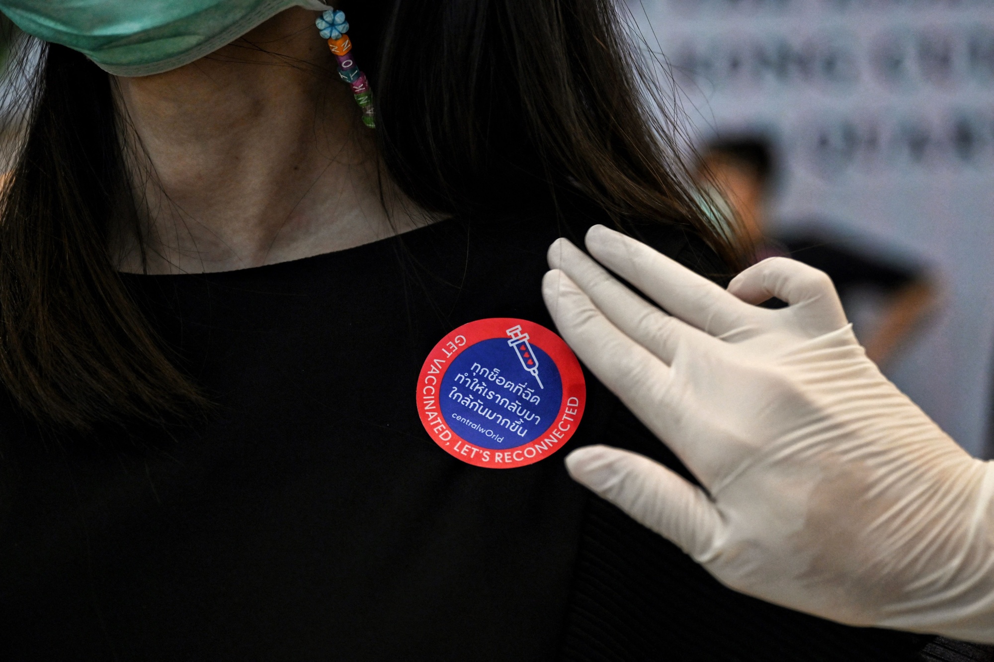 一名妇女在曼谷接种新冠疫苗前获得了一张贴纸。