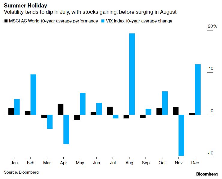 随着全球股市在六月份按照季节性脚本上涨,如果历史模式保持不变,七月份应该也会是同样的情况。根据彭博社编制的数据,过去10年中,MSCI AC全球指数本月平均上涨了1.9%,波动性——如VIX指数所衡量的——已经有所回落。
