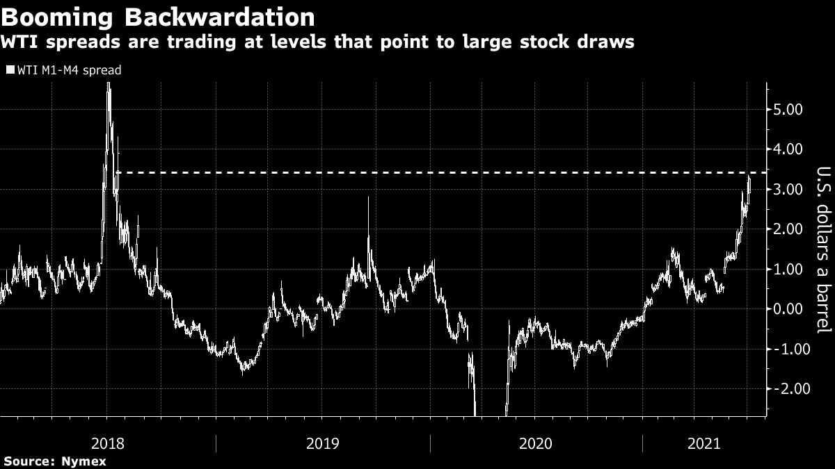 美国市场将在长周末后迎来石油市场的戏剧性变化和通货膨胀困境。OPEC的最新一轮内讧会在长期内推高还是降低油价?目前市场关注可能因该组织未能就增加供应达成协议而导致的短期价格行动。TD证券的分析师们谈到僵局可能助长原油价格在夏季爆发,全球基准布伦特原油价格已经在2018年以来首次短暂突破77美元。与此同时,市场进一步进入极端的逆转水平,交易员正在定价更为紧缩的库存。美国最近已经减少了石油库存。