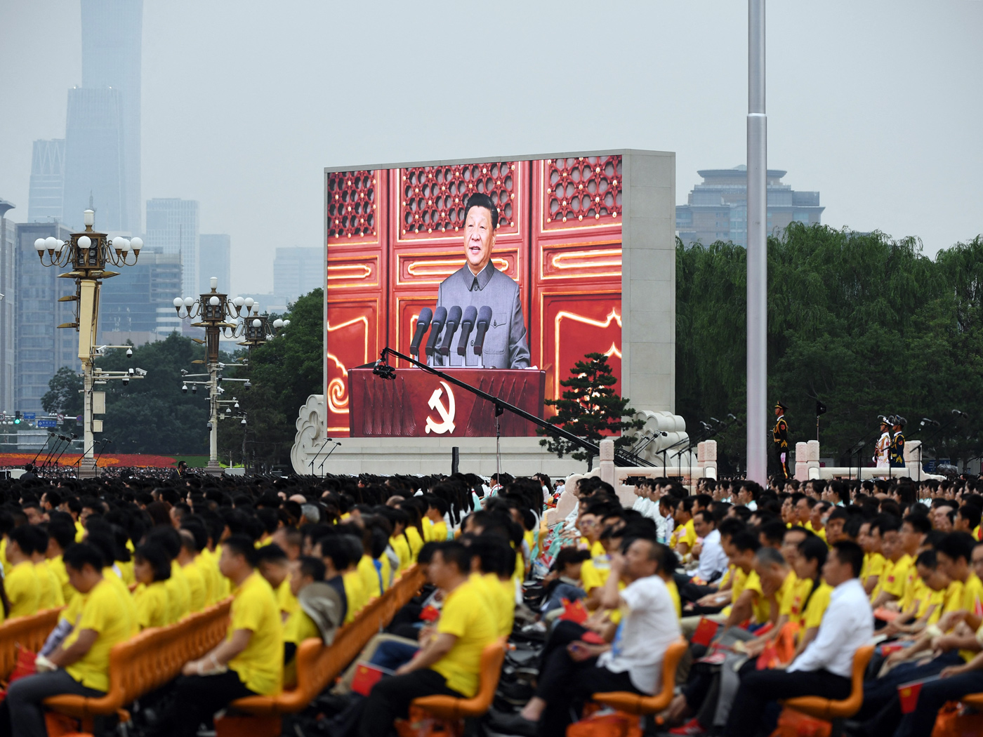 中国国家主席习近平(屏幕上)7月1日在北京天安门广场庆祝中国共产党成立100周年时发表讲话。
