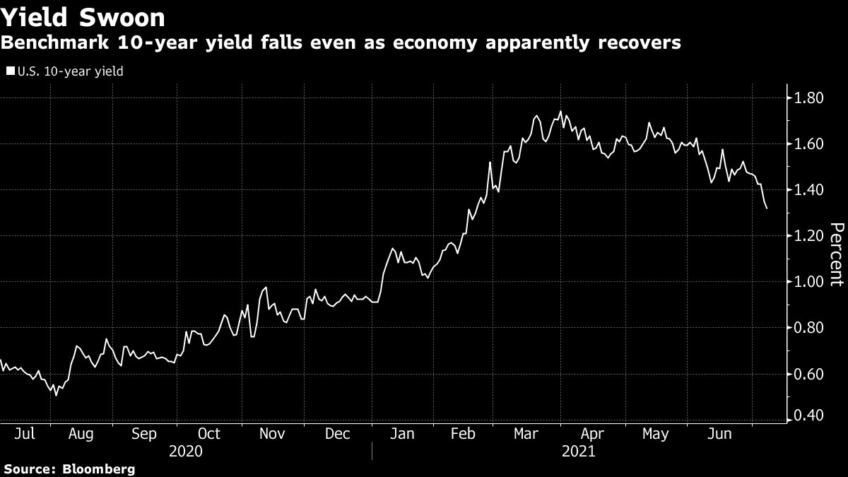 显然,今天的情况不同,因为美联储不会很快提高利率,但债券收益率持续走低 —— 基准10年期国债在周三曾短暂跌破1.3% —— 与仍然相对强劲的美国经济复苏之间的矛盾显然令市场参与者感到困惑。