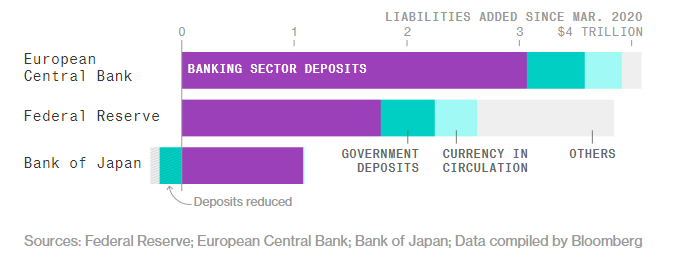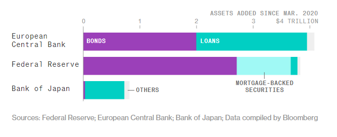那么这些钱都去哪了呢?这三家中央银行购买了大量债券,帮助它们的政府资助刺激计划。美联储购买了更高比例的抵押贷款支持证券,急于支持在2008年全球金融危机期间造成如此多麻烦的部门。欧洲央行和日本银行则更多地通过贷款来支持,使企业得以维持运营,员工保住工作,并防止坏账不断积累。