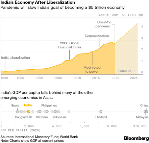 印度因Covid-19而遭受的破坏突显了卫生保健和基础设施的重要性 —— 在自由化后的繁荣时期经常被忽视 —— 正阻碍着这个国家及其人民。总部位于班加罗尔的阿齐姆·普雷姆吉大学计算,超过2亿人已经回到每天不到最低工资标准5美元的收入水平。