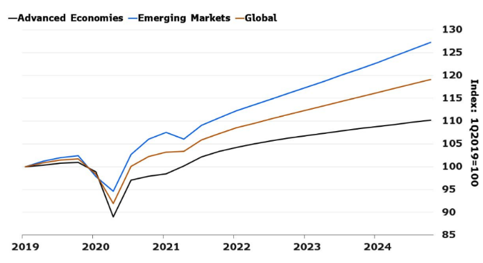 根据彭博经济学,全球经济正在进入2021年复苏的最快阶段。在新冠感染的新波浪迫使欧洲和印度实施封锁的开始阶段后,增长在第二季度末加速。随着重新开放的进行,第三季度应该会更加强劲,并且势头在年底基本上会得以保持。这将使全球经济增长率在2021年全年达到6.9%,并在2022年放缓至4.9%。