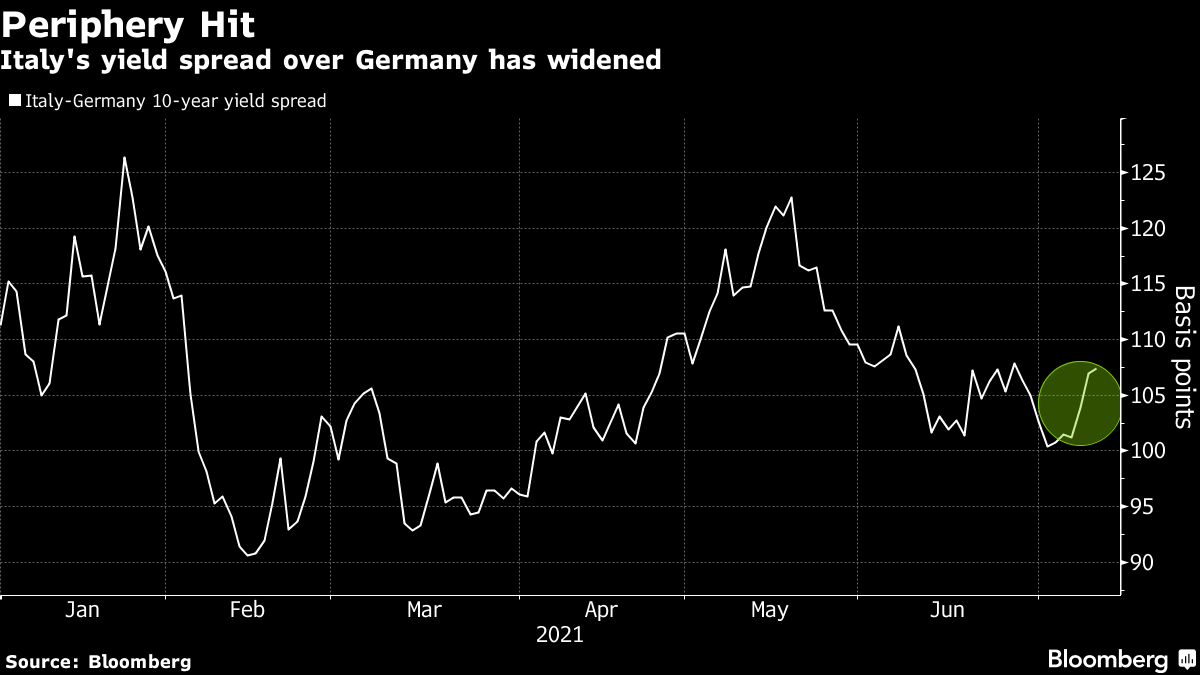 除了联邦储备委员会的比较之外,有很多怀疑论可以解释欧洲央行讯息引起市场动荡的原因。欧元已经回落了一点点。德国债券收益率略有上升,但意大利和西班牙的上涨幅度超过了德国。Societe Generale的策略师表示,这是周边市场的买入信号,他们预计央行将在7月22日的会议上正式确认其对超宽松政策(继续购买资产)的承诺。