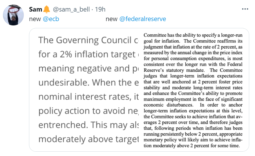 - 更加谨慎 | 欧洲央行朝着美联储的方向迈出了一步,制定了2%的新通胀目标,但在经济复苏后没有做出类似的承诺让经济保持热度。