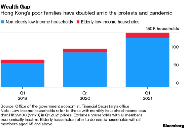 香港从疫情和政治抗议引发的衰退中逐渐复苏,凸显出该市工薪阶层和精英之间日益加剧的财富差距。财富不平等。