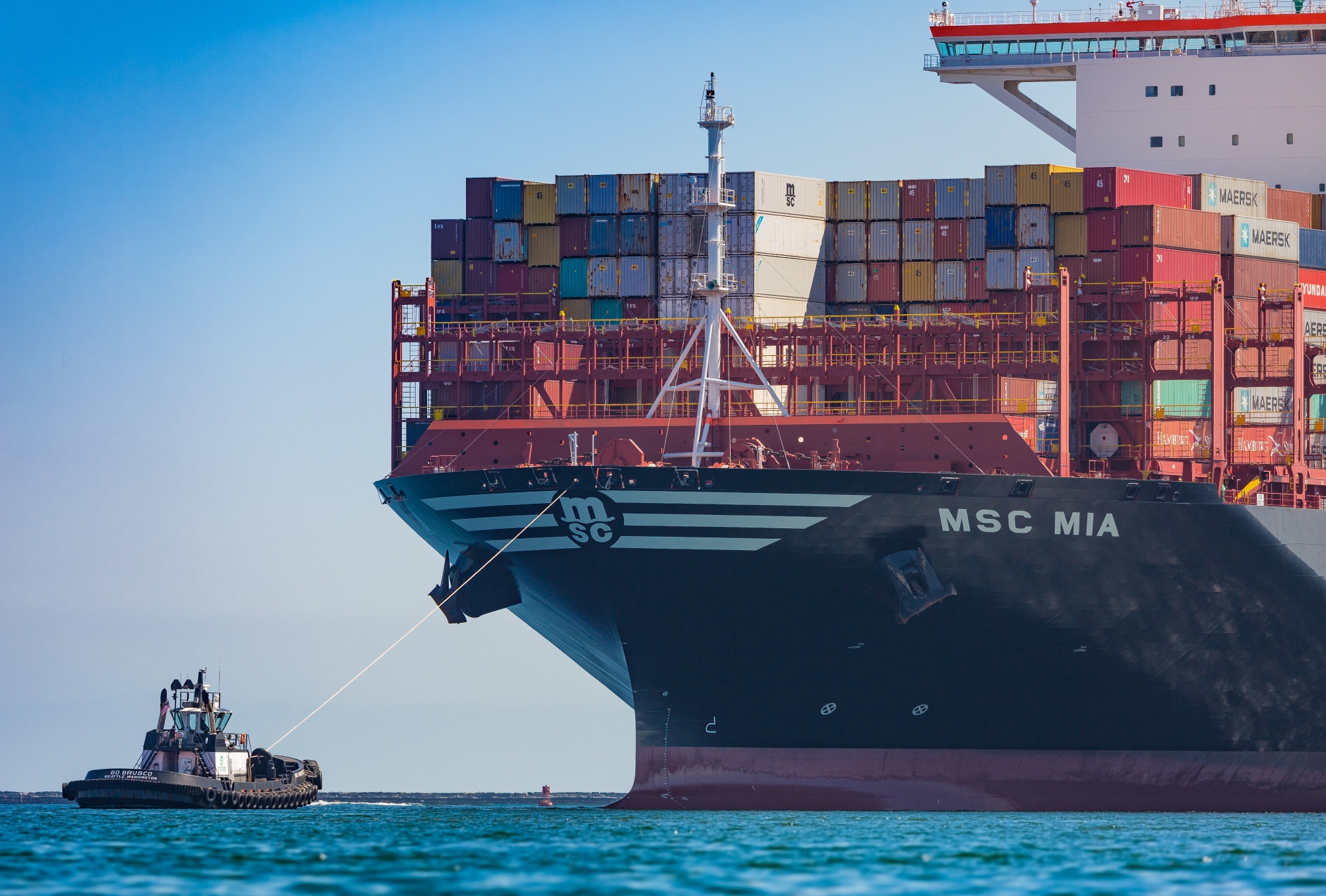 拖船引导地中海航运公司(MSC)Mia货船抵达美国加利福尼亚州洛杉矶港口,摄于2020年4月1日。摄影师:Tim Rue/Bloomberg### 你应该阅读的内容