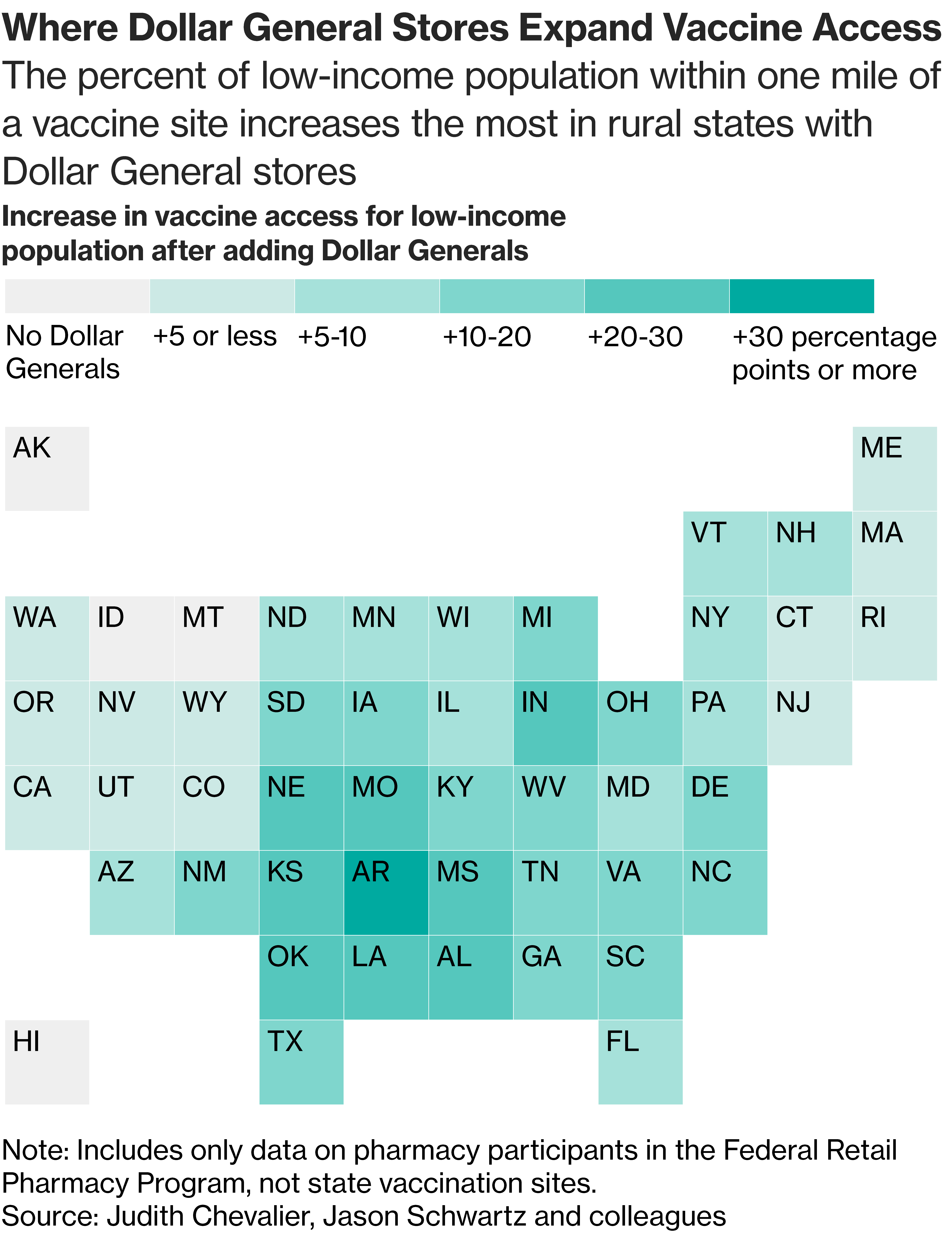这是疾病控制与预防中心曾经考虑过的一种策略,但他们在5月决定不与Dollar General进行正式合作。但由耶鲁大学的Judith Chevalier和Jason Schwartz领导的研究显示,在Dollar General的位置作为疫苗接种点将增加几个州低收入社区的接种机会。