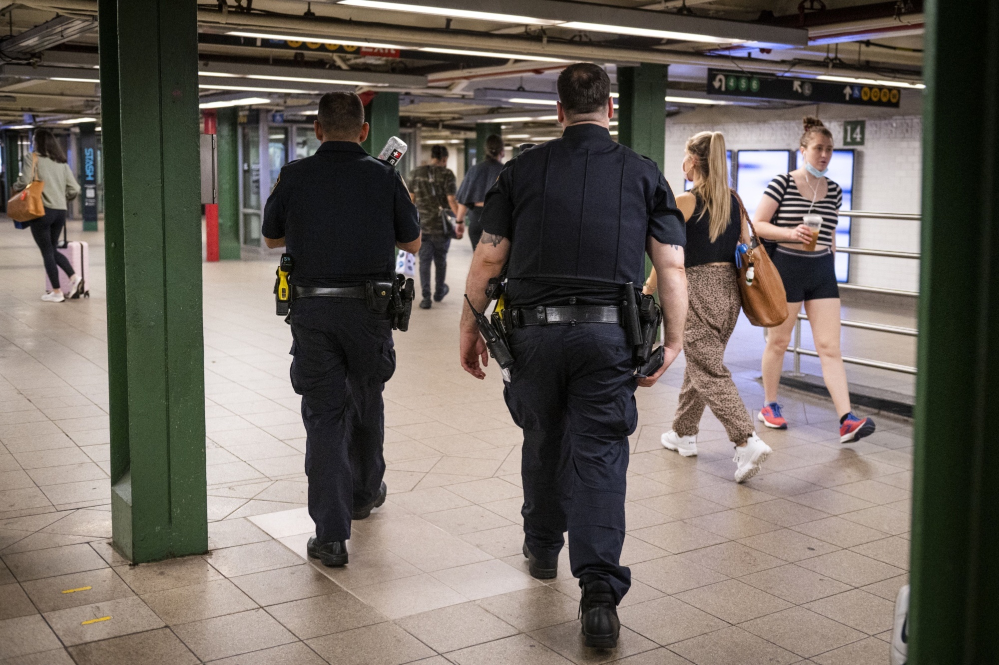 警察于2021年7月2日在联合广场地铁站内行走。一份新报告主张减少对低级违法行为(如逃票或公共睡眠)的警务关注,并增加受过训练以应对无家可归和心理健康危机的非武装人员。