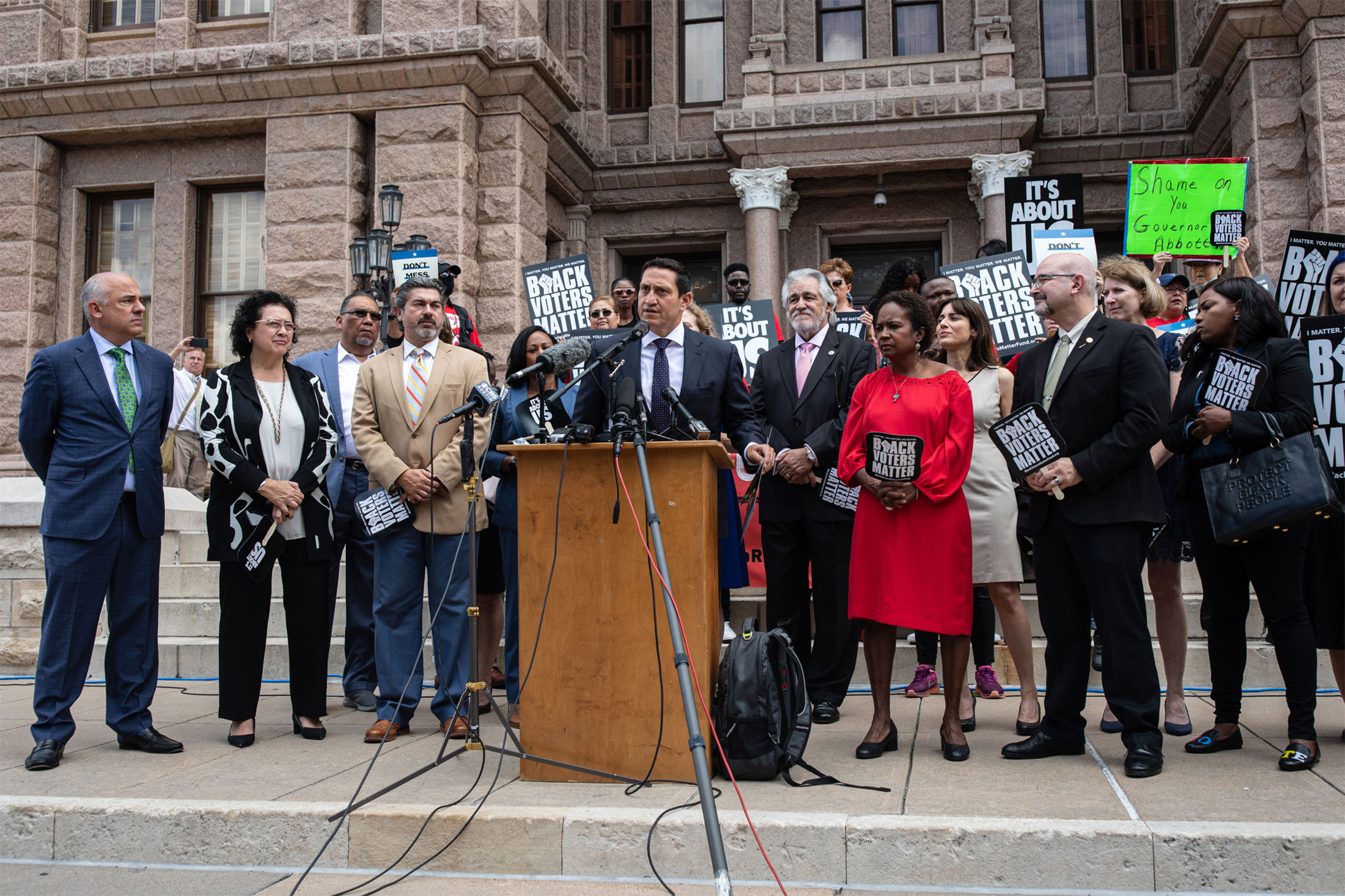 得克萨斯州立法机构的民主党成员在7月8日在奥斯汀得克萨斯州议会大厦外举行新闻发布会。摄影师:Tamir Kalifa/Getty Images美国选民权利倡导者一直在要求华盛顿采取大胆举措;昨天,他们得到了一项大胆的举措。
